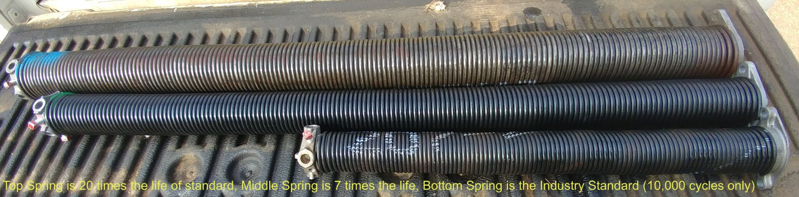 We believe there to be a decent value point for spring Lifecycles to be somewhere around 7x the industry standard or so. For those people who truly intend to live in their house until “death do ye part”, it is probably worth the extra cost of going for 20x the industry standard as that’s a very safe bet that you truly will never have to bother with broken springs again in your life (and perhaps your children’s lives as well!). Accordingly we offer these 2 different standard options (our standards) at very reasonable and decent value points. Furthermore we keep in stock the most popular sizes for most doors and it’s possible to have same day service as well.